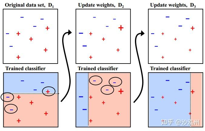 Adaptive Boosting,基于 Boosting 思想实现,核心思想是逐步提高那些被前一步分类错误的样本的权重来训练一个强分类器。算法流程如下:
